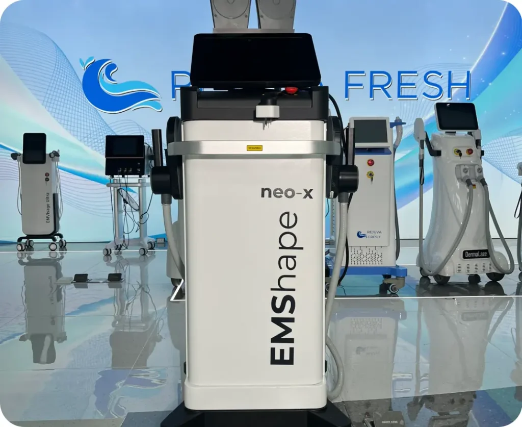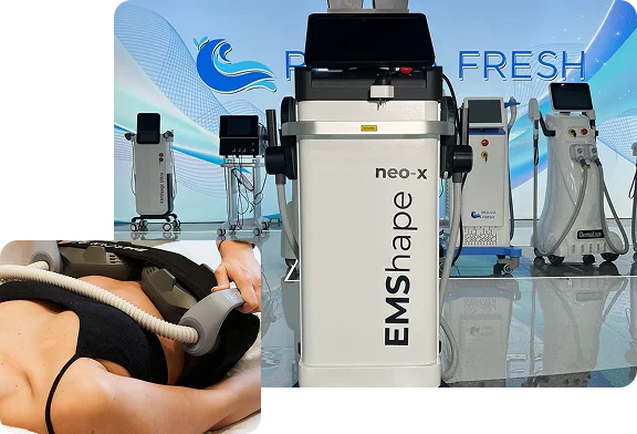 EMShape Neo-X uses synchronized electromagnetic muscle stimulation and radiofrequency to burn fat while building lean muscle — in the same session.